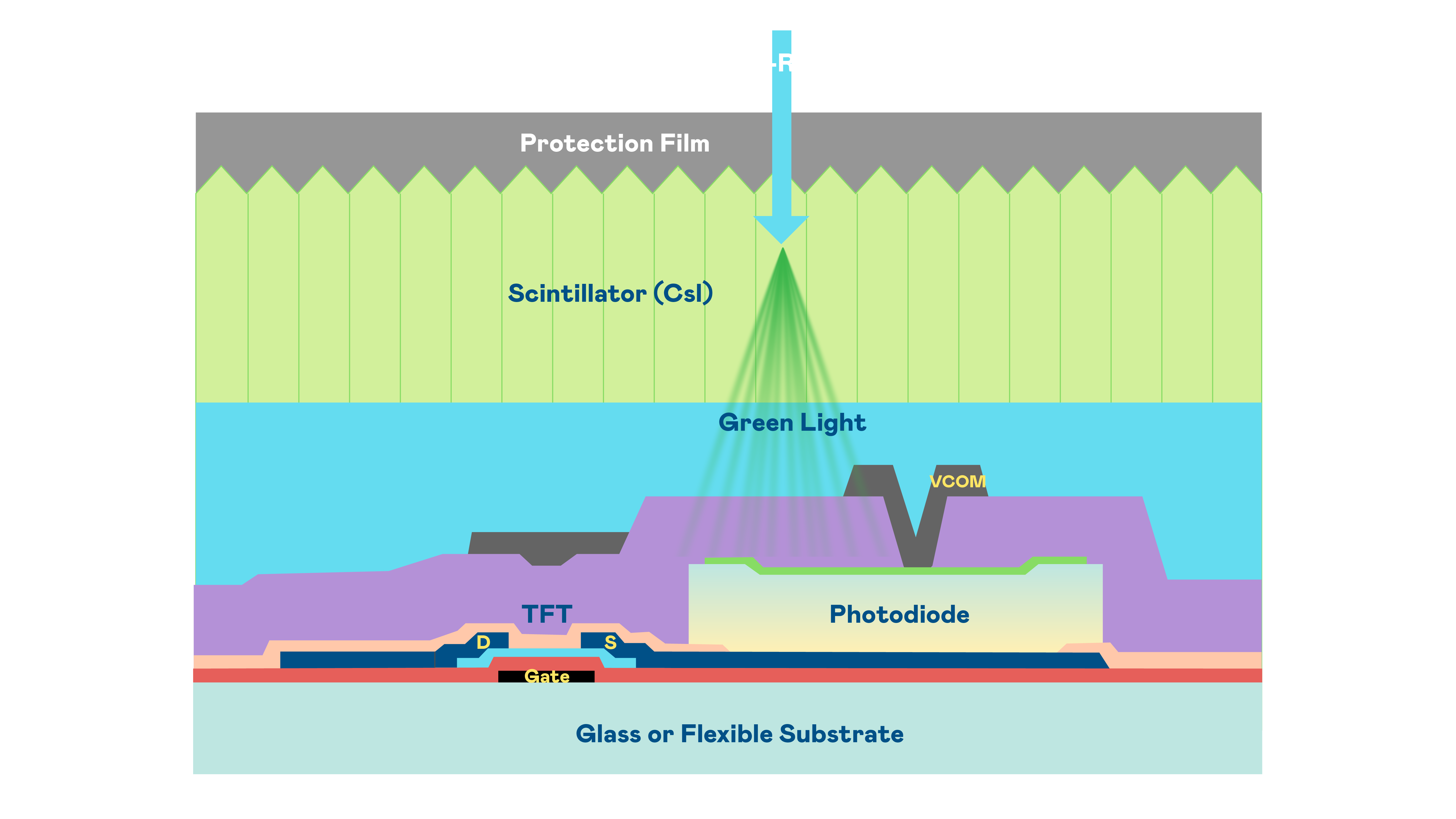 抖圈的X光影像感測陣列使用薄膜電晶體 (TFT) 作為每個像素的讀取開關,搭配光電二極體(Photodiode)的光電轉換元件,用以感測X光影像訊號。